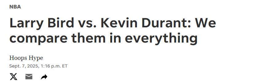杜兰特VS伯德!针对贝弗利在节目中公开表示杜兰特与伯德之间差距并不大这一争议言论,美媒《hoopshype》通过8大板块全面对比两大巨星给出答案,结果5-3差距明显。